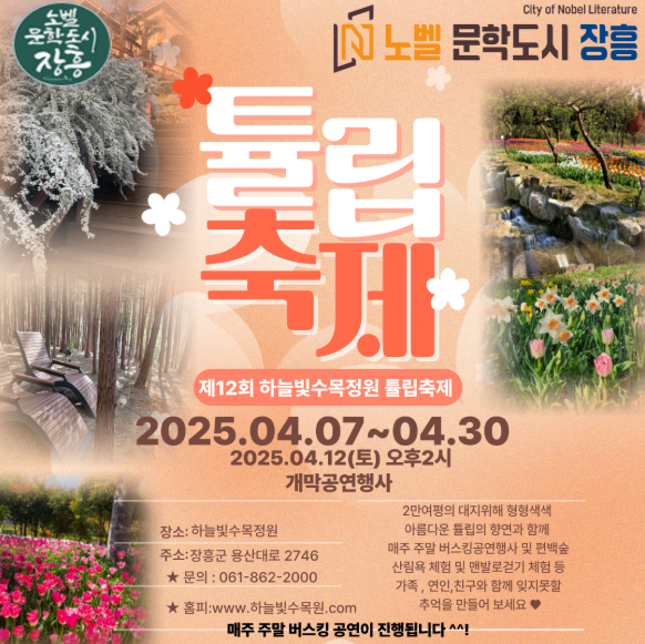 하늘빛수목정원 튤립축제는 2025년 4월 7일부터 4월 30일까지 약 한 달간 진행돼. 남도의 따뜻한 기운 속에서 펼쳐지는 이 축제는 꽃을 사랑하는 사람들에겐 그야말로 천국! 이번 글에서는 하늘빛수목원 튤립축제 일정부터 포토존, 체험 프로그램, 꿀팁까지 싹~ 정리해줄게.